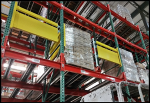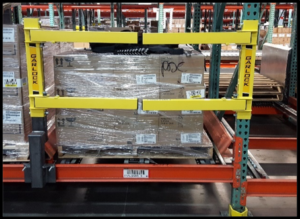 Distribution and fulfillment companies are always looking for ways to maximize their spaces, so they frequently use mezzanines and elevated workstations to fill their buildings to capacity. After a safety audit, a major cosmetic company contacted their trusted safety distributor to provide the following safety solutions: a staged inflow of palletized bulk products for their pick/pack operation and protection for their employees from the open work edges created after pallets clear the rolling racks. To meet all the company’s needs, the operations were broken down into the two phases: product inflow and empty pallet outflow.